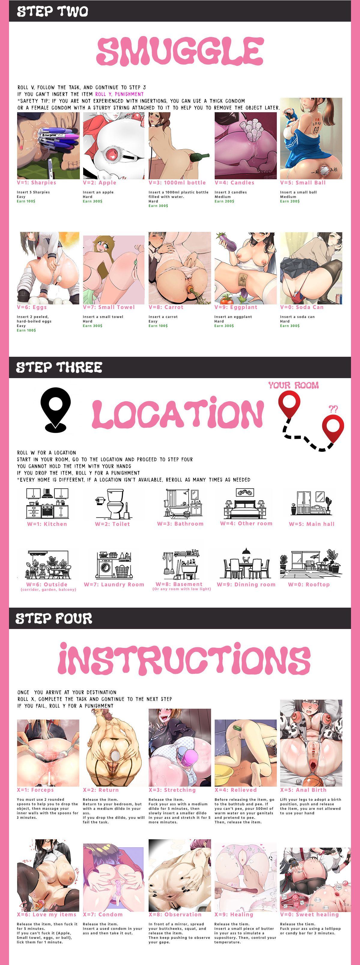 You must transport a variety of items in your ass from one room to another. If you fail to insert it or drop it, you will be penalized.