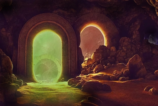 One of the portals is red, and you see a continuation of the cavern with huge paintings, the other is green, and you can see a forest on the other side.