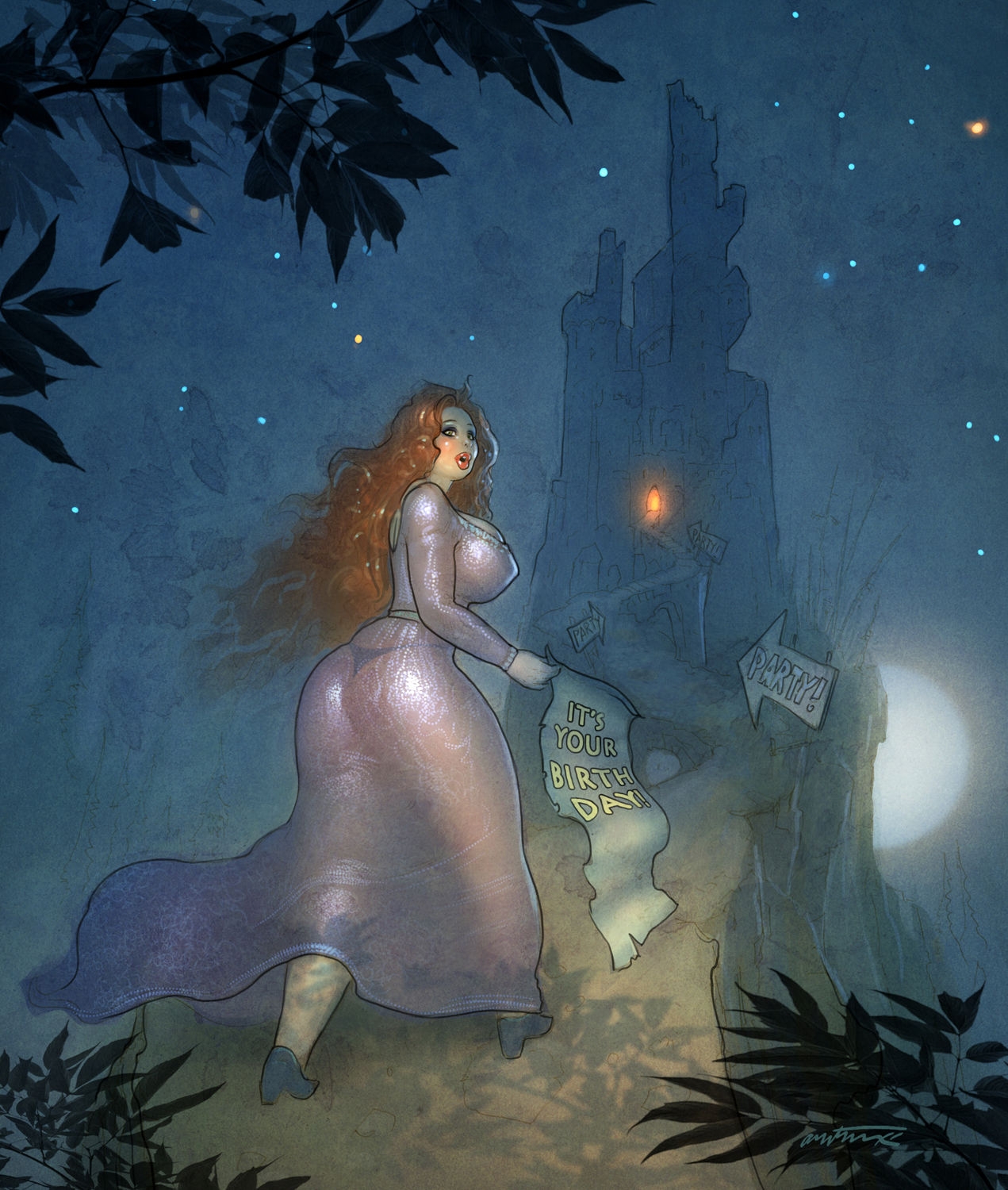 When you arrive at the old watch tower, a group of small magical creatures gives yo a cake, they believe your story and say that they can teleport you when the sun rises. You feel extremely tired, and after a few minutes of talking and eating at the party, you fall asleep on the floor.