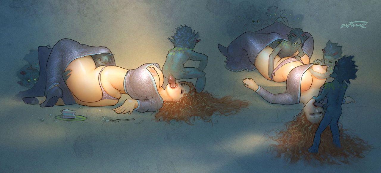 They move your panties and start to use your ass and mouth at the same time, the cake has a powerful potion for sleeping and dilating your holes. You act like a zombie, one of them stretches your ass easily and fucks you. You feel something inside your ass that feels funny.