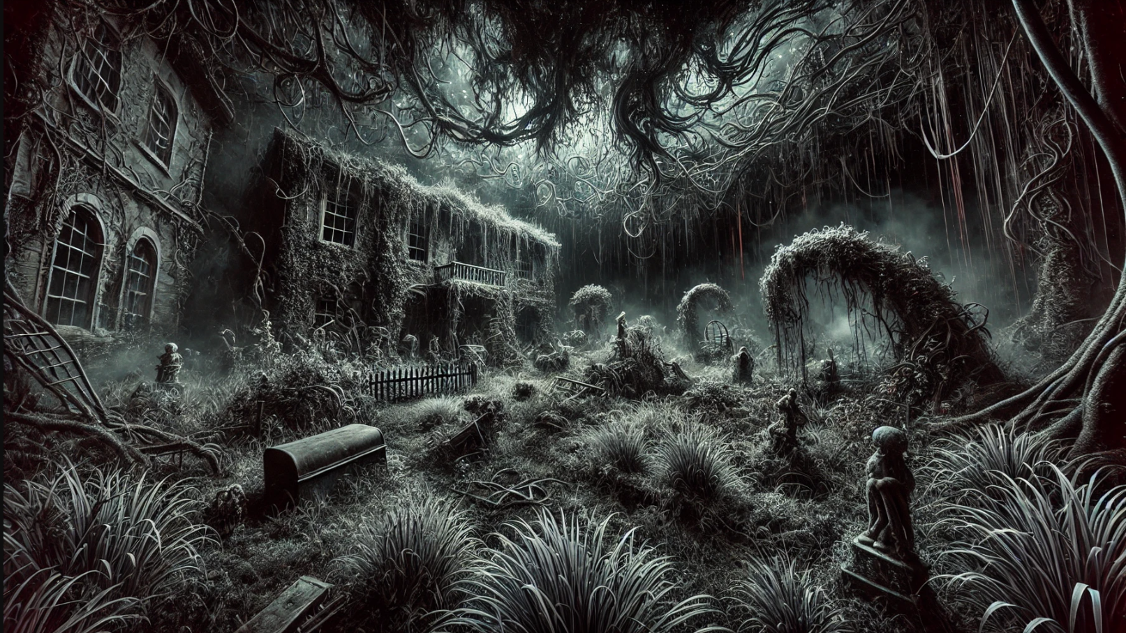 You arrive at the garden, the high grass reaches to your knees. Statues lay half-buried under layers of miasma and vines.