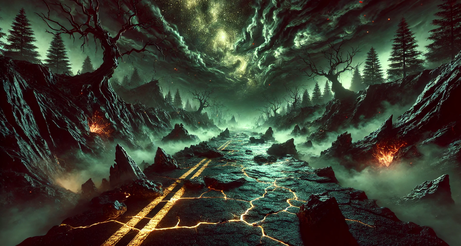 You take the cracked road, the asphalt radiates heat, each fissure filled with a strange luminous energy. Avoiding the big stones, you notice shadows dancing around you, projected by the dead trees and blackened pines at the side of the road. The miasma floating in the sky and the fog make you feel unsafe.