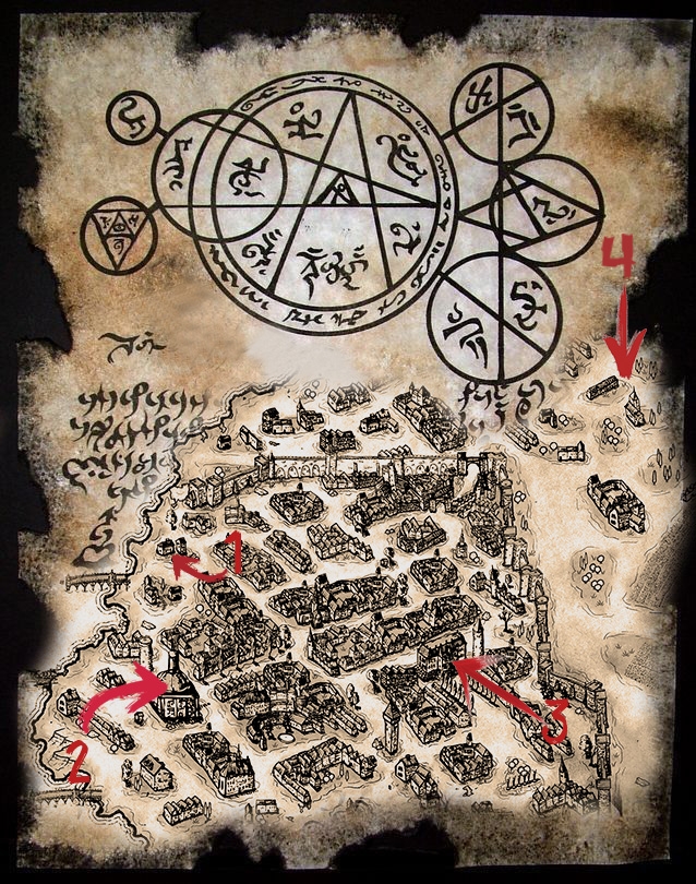 The map signals 4 different locations with the symbols of portals to return to your home...