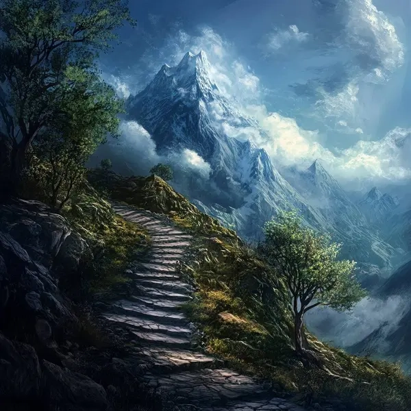 Before you, the path splits, one leads you toward a majestic temple of white stone, the towers are invisible from a distance you notice them here, they reach the sky and pierce the clouds. The other descends into the throat of an active volcano.