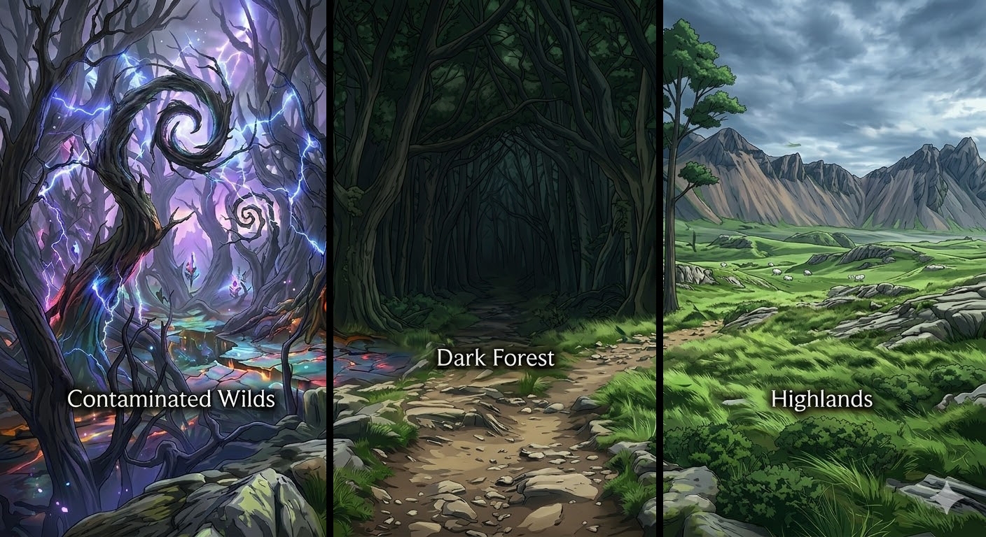 To your left, the Contaminated Wilds are plagued with unstable magic, trees twist into impossible spirals, some of them are alive, and static crackles in the air, but no one dares to enter here.