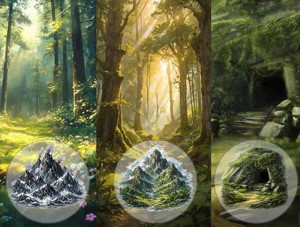 The path is long but peaceful, you appreciate the sunlight filtering through the canopy above. The forest is full of life, birds chirping, leaves rustling, and small animals gathering food. Ahead, the path splits slightly, revealing a narrow trail leading to a dark, mysterious cave nestled into the hillside. Its entrance is framed by rounded rocks, and an eerie stillness surrounds it, as if the forest itself holds its breath, this is not natural.