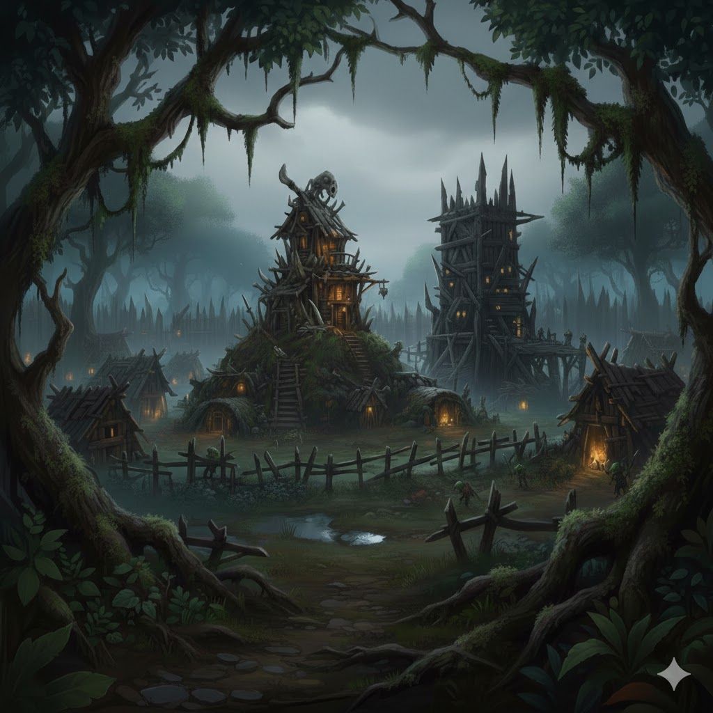 You arrive at the goblin village, you spy between the dense vegetation, far away from the palisade. You notice a chaotic jumble of huts, caves, and wooden fences. At its center is the chieftain’s dwelling, a grotesque structure of scavenged wood and bones with a red banner flapping in the wind. But another building catches your attention too, a windowless fortress of blackened woods, its walls are reinforced with jagged spikes and goblin sentries patrol around it scanning for threats.
