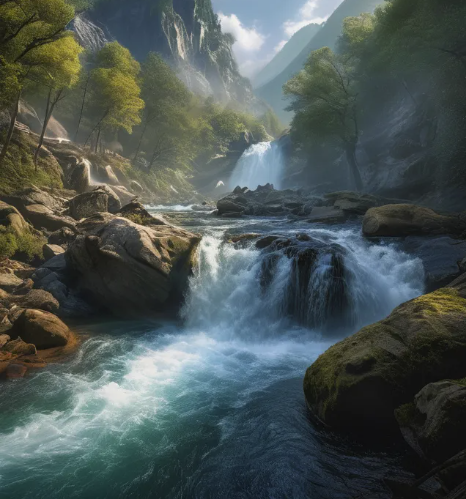 You arrive at a beautiful river, the current is swift, creating a dance of cascades and small whirlpools. it carves its way through the landscape.