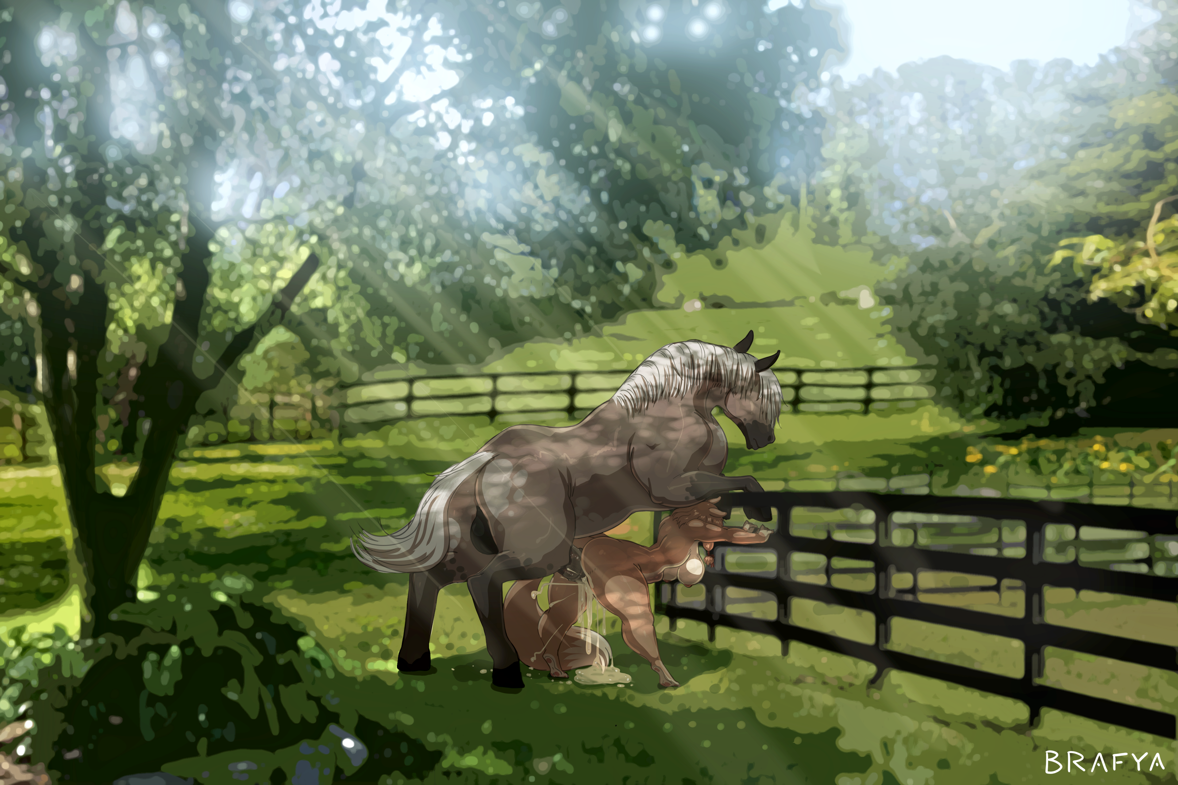 However, the horse seems to interpret this differently. It suddenly aggressively tries to position itself behind you, pushing you against a fence. At first, you attempt to escape and push it away, but the horse is persistent and clearly aroused. Its enormous penis grows, brushing against you.
