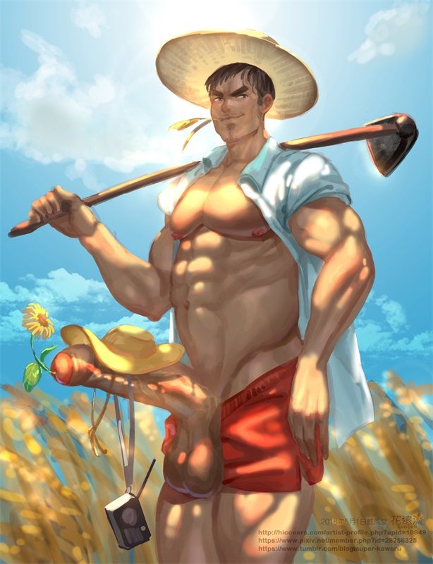 You walk through vast wheat fields searching for anyone, eventually encountering a muscular farmer working. The day is hot, and his upper clothing hangs loose, revealing a sculpted torso of prominent muscles.
