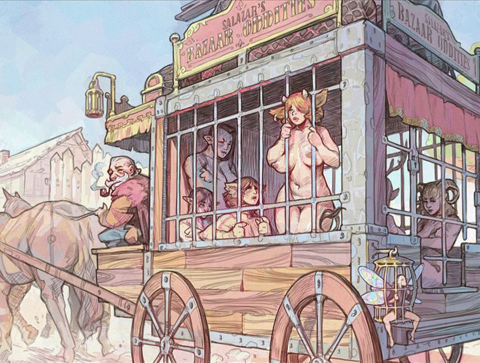 You hear the steady sound of wagon wheels and realize you are moving. You open your eyes and notice you are no longer in the forest. Instead, you’re inside a cage on a wagon, naked alongside other prisoners of various races. You try to sit up (enduring the pain in your cavities) and ask the others where you are and what fate awaits everyone.