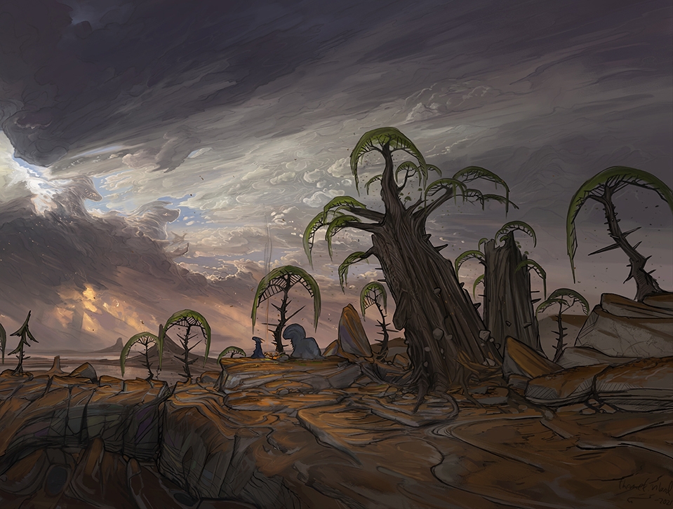 As dawn breaks, the landscape reveals itself to be a desolate rocky area with only a few sparse trees.