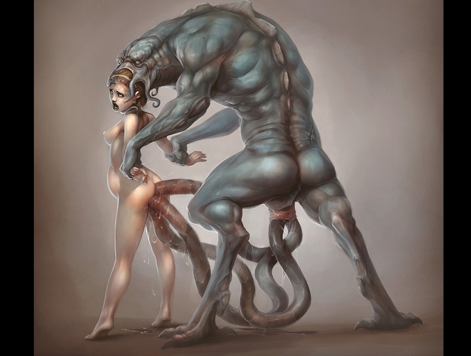 The creature is feeding on your pain, fear, and desperation... He starts to pump a thick cum inside your body, and your belly grows, when you notice this terrible event, you panic and are terrified, and you struggle more... pleased the creature continues.